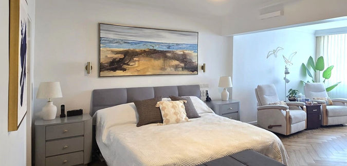 A stunning beach scene by artist Nitzan Fux became the room’s focal point, customized with hints of grey to tie in with the remaining headboard and side tables.